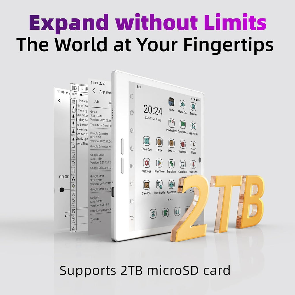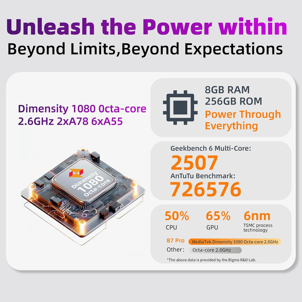 Olvida la lentitud de la tinta electrónica tradicional. El Bigme B7 Pro integra el poderoso chip MediaTek Dimensity 1080 (Octa-Core 2.6GHz). Combinado con una memoria masiva de 8GB RAM + 256GB, ofrece una fluidez nunca vista, logrando una puntuación AnTuTu de 720.000. Es un smartphone, una tablet y un lector a color, todo en uno.