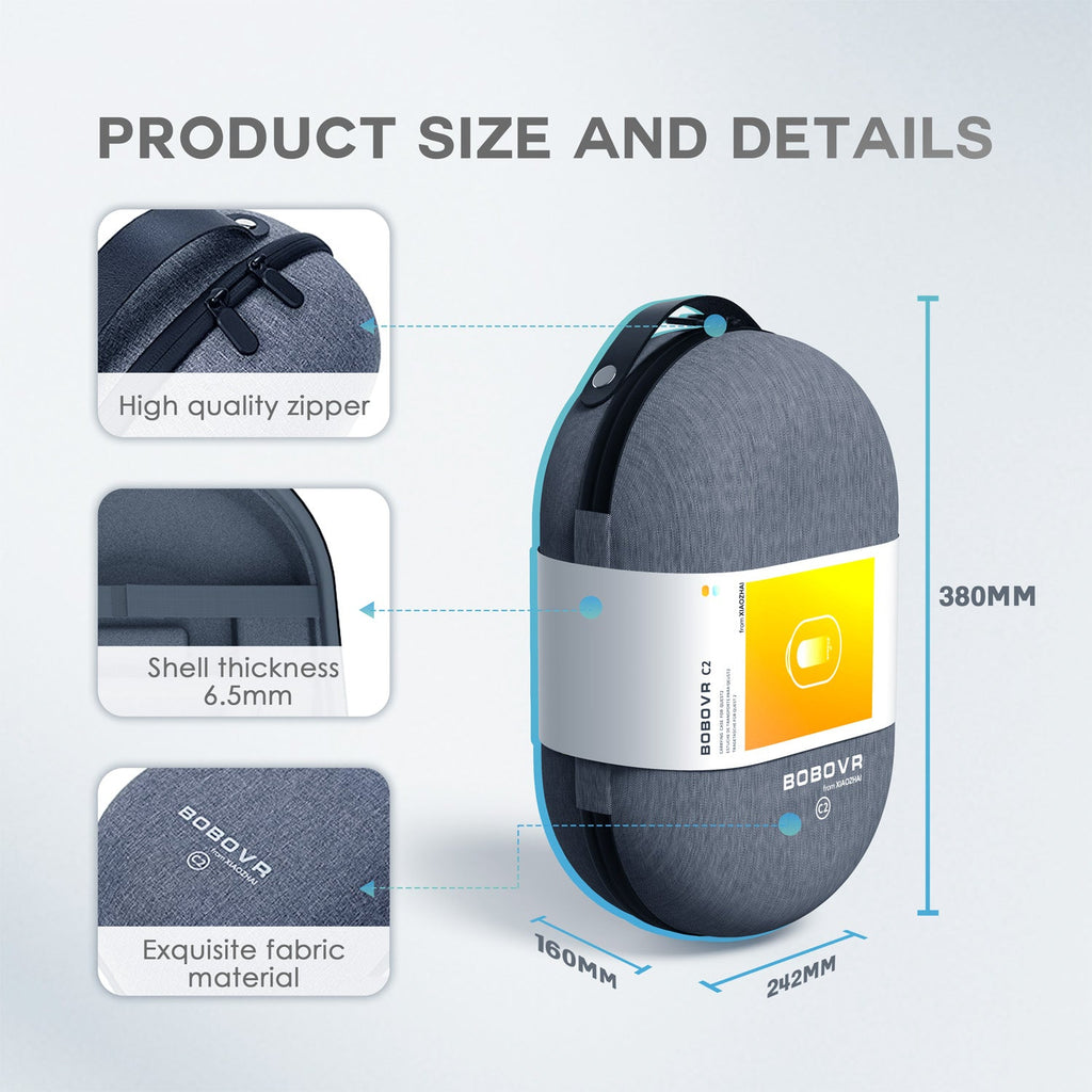Este estuche de transporte C2 está especialmente diseñado para ser compatible con Quest 2 y BOBOVR M2 posee un gran área de almacenamiento para una banda de tamaño inferior a 6 in. También funciona con bandas oficiales Elite y varios tipos de correas (actualmente no es compatible con correas DAS).