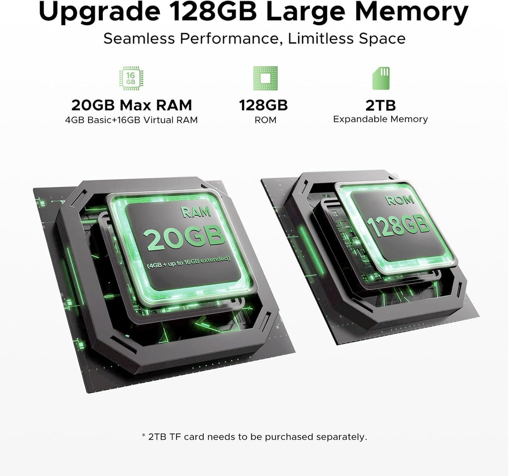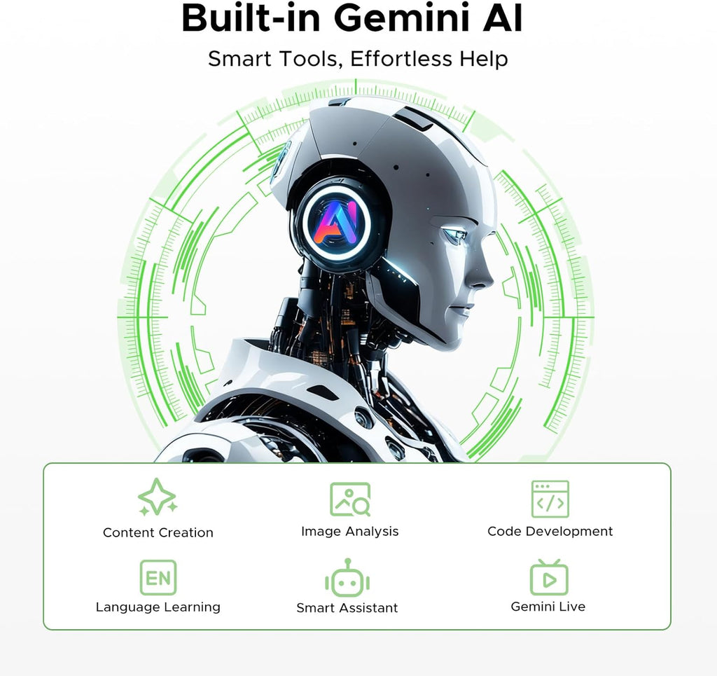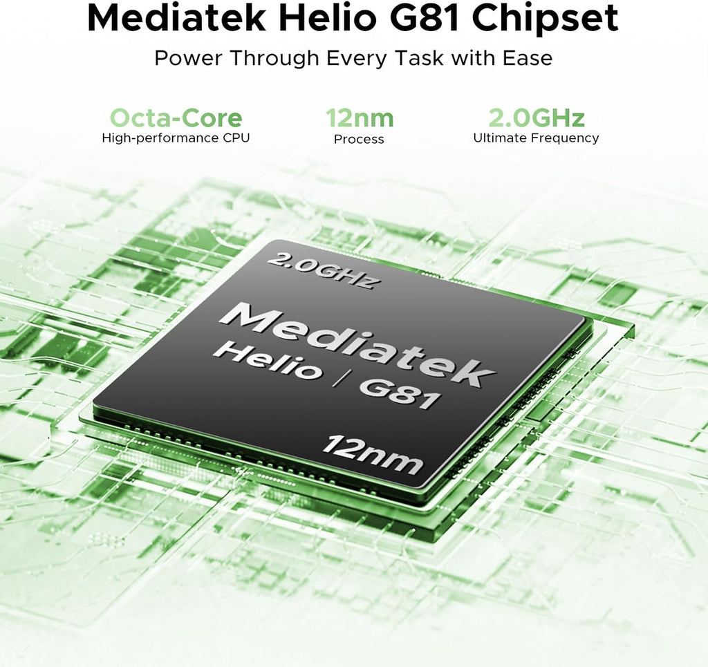 Eficiencia inteligente. Equipado con el procesador Helio G81 y la IA de Gemini, optimiza la batería y el rendimiento. Cuenta con 20GB de RAM Total (4GB físicos + 16GB virtuales) para una multitarea básica fluida.