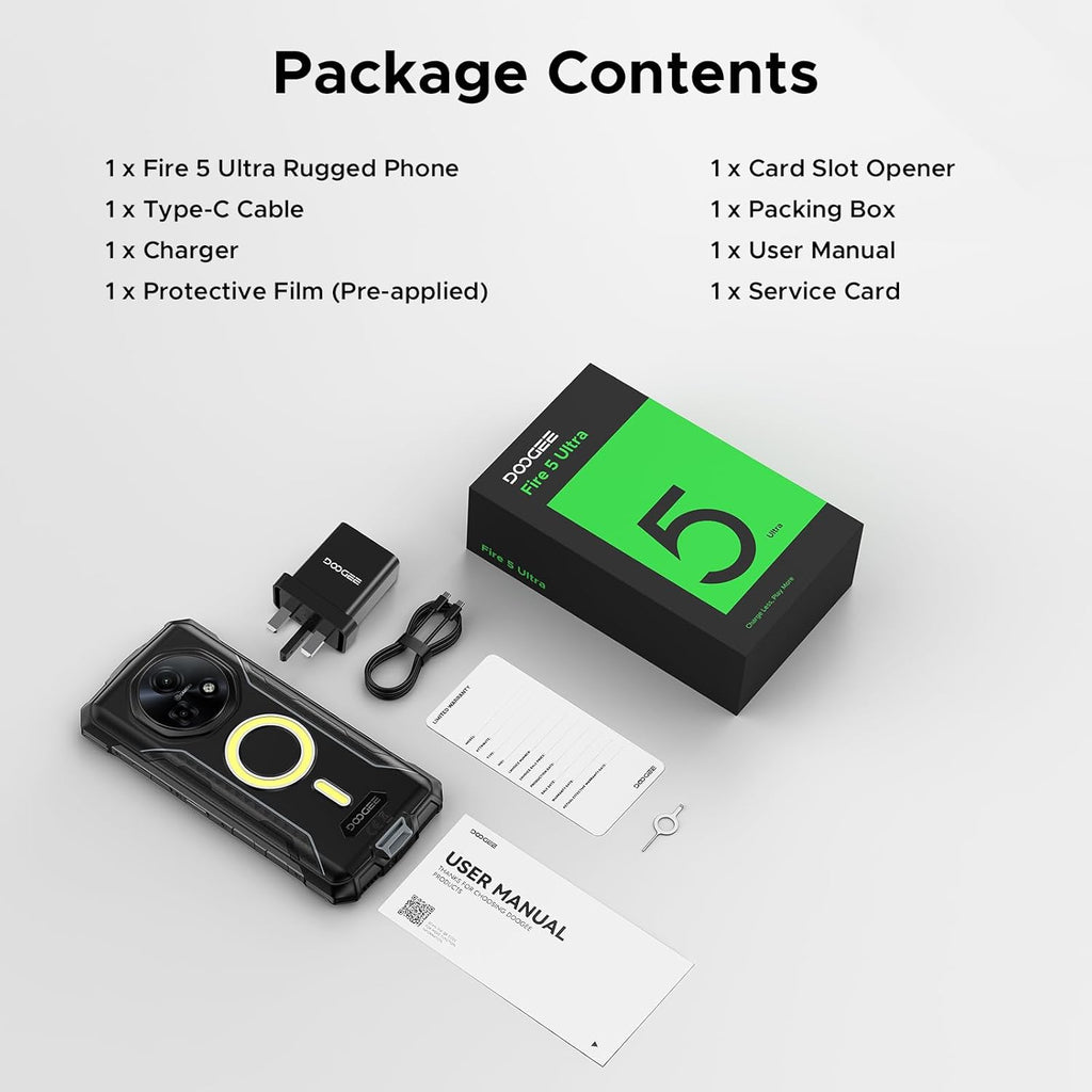El DOOGEE Fire 5 Ultra es más que un teléfono; es tu herramienta de supervivencia. Con 13000mAh de batería, potentes luces de camping de 1200 lúmenes y Android 15 con IA Gemini.