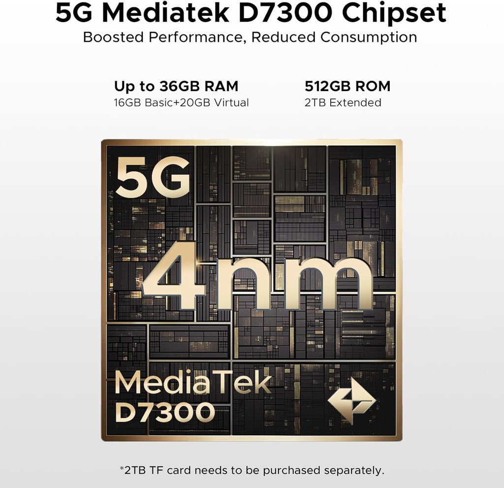 Impulsado por el procesador Dimensity 7300 5G y Android 15. Equipado con una memoria masiva de 36GB de RAM (16GB físicos + 20GB virtuales) y 512GB de almacenamiento (ampliable a 2TB), para que la multitarea vuele.