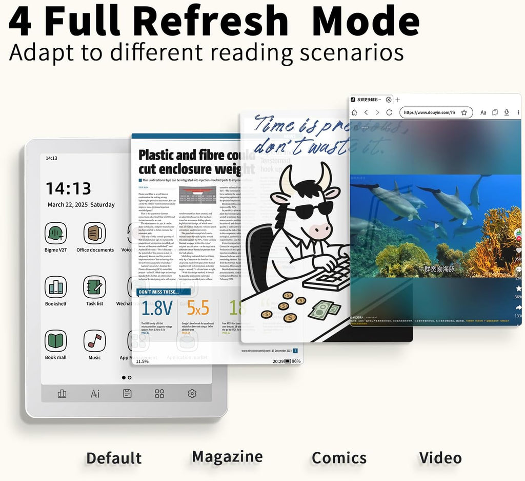 • 4 Modos de Refresco: Optimiza la pantalla para lectura, navegación web o incluso video.
