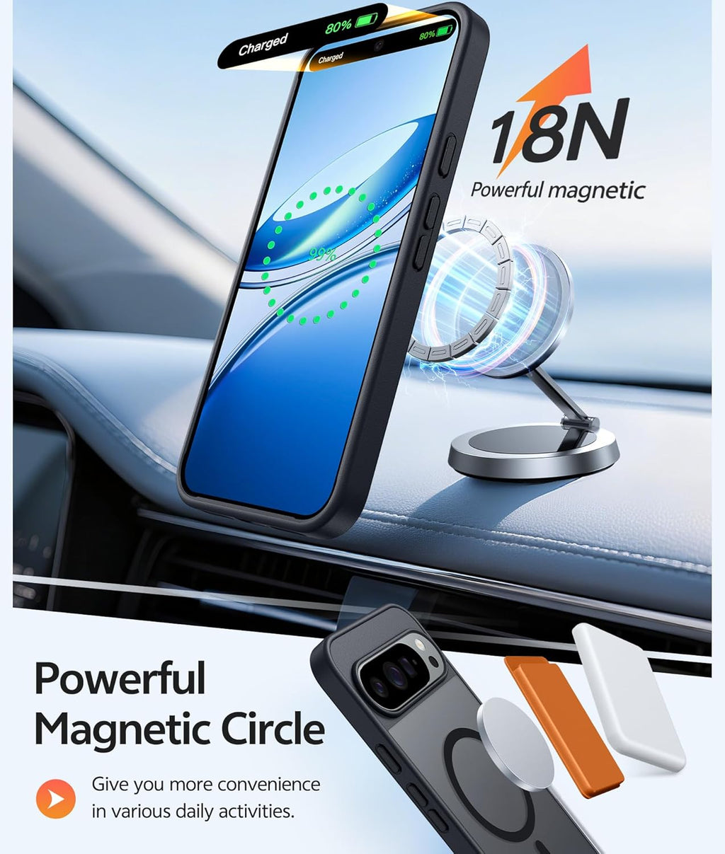 • Potente imán: La funda para Pixel 10 es compatible con cargadores magnéticos e inalámbricos sin interferencias de señal. Nuestra funda para teléfono incorpora 38 imanes Super N52. Su fuerza de atracción magnética alcanza los 2400 gf, casi 7 veces mayor que la de una funda convencional, por lo que no se caerá ni siquiera con la carga.