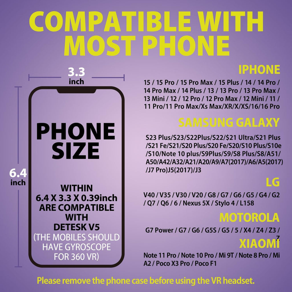 - Retire la funda del teléfono antes de usar las gafas de realidad virtual. MODELOS DE TELÉFONOS COMPATIBLES: las gafas DESTEK V5 VR admiten teléfonos con un SENSOR GIROSCOPIO (TELÉFONO DE 6.4*3.3*0.39 pulgadas L*W*H), como para iPhone 16/16 Pro/iPhone 15/15 Pro/15 Plus/14/14 Pro/14 Pro Max/14 Plus/13/13 Pro/13 Pro Max/13 Mini/12/12 Pro/12 Pro Max/12 Mini/11/11 Pro/11 Pro Max/Xs Max/XR/X/Xs, para Samsung s23 plus/s23/s22 plus/s22/s21 plus/s21 fe/s21/s21 Ultra/s20 plus/s20 fe/s20/S10 Plus/S10e/s10/note 20/note 10 plus/s9plus/s9/s8 plus/s8/A51/A50/A42/A32/A21/A20/A9/A7(2017)/A6/A5(2017)/J7Peo/J5(2017)/J3 (NO APTO PARA iPhone 16 Plus/16 Pro Max/15 Pro Max, Samsung Galaxy S24 Ultra/S23 Ultra/S22 Ultra/S20 Ultra)