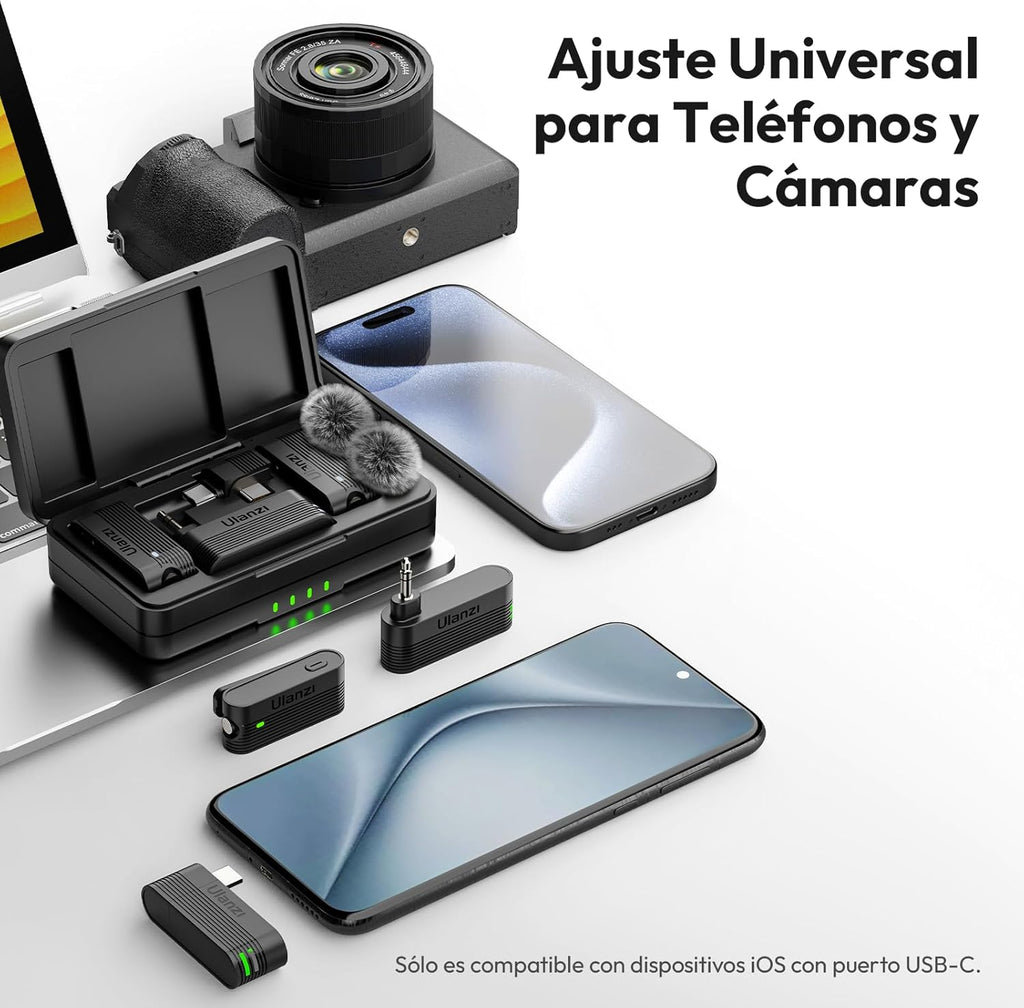 No necesitas comprar adaptadores extra. El estuche todo en uno incluye conectores Type-C y 3.5mm, haciéndolo compatible nativamente con Android, iPhone (USB-C) y cámaras DSLR. Todo organizado y listo para la acción en un solo lugar.