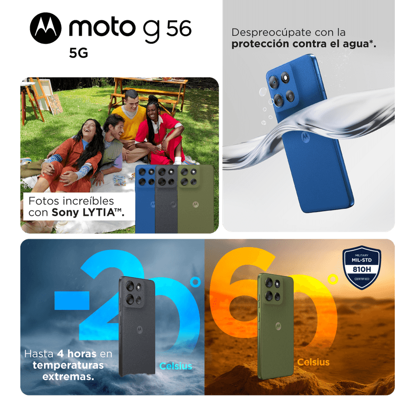 El Moto g56 5G establece un nuevo estándar de robustez en la gama media. Construido para soportar los desafíos de la vida real, cuenta con certificaciones IP68 e IP69 contra agua y polvo, además de cumplir con estándares militares MIL-STD-810H. Su pantalla está blindada con Corning® Gorilla® Glass 7i, ofreciendo el doble de resistencia ante caídas y rayones, todo envuelto en un acabado sofisticado (disponible en PANTONE Dazzling Blue o Gris).