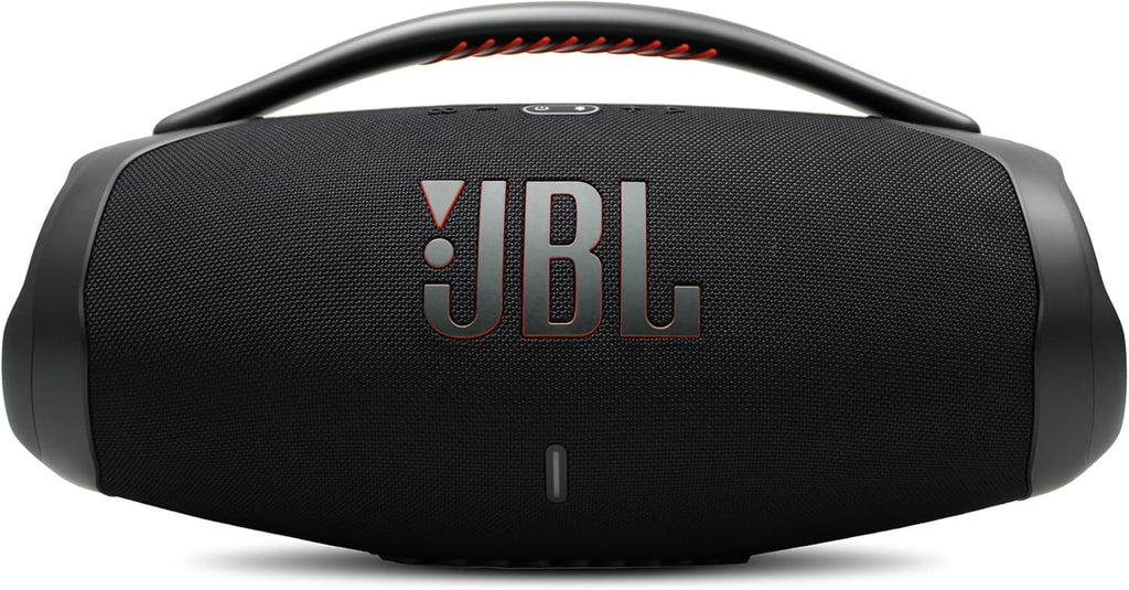 El altavoz Bluetooth portátil JBL Boombox 3 combina una estética clásica con una funcionalidad moderna. Su elegante diseño en negro, su robusta asa de metal y sus agarres de silicona naranja lo hacen fácil de llevar a cualquier parte.