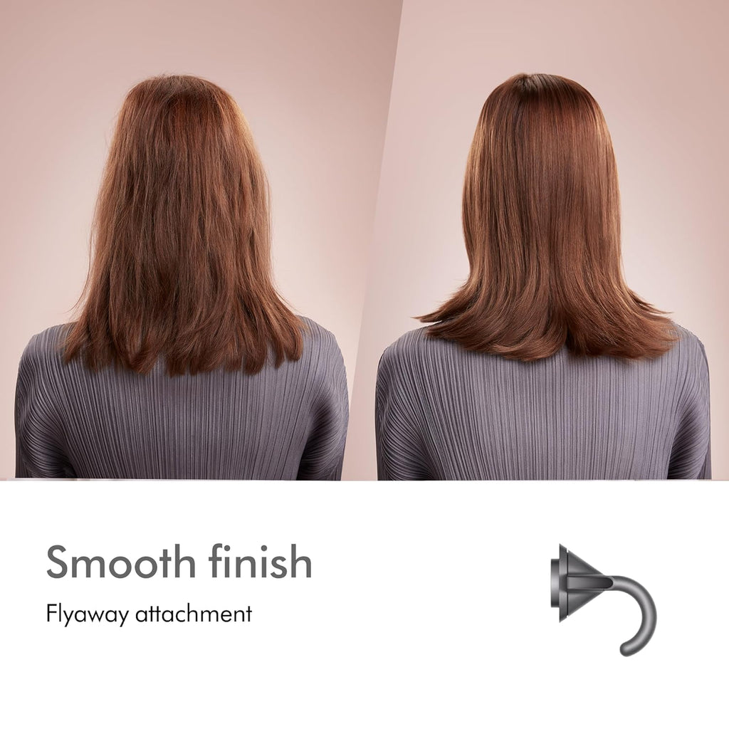 🌪️ Accesorio Flyaway (Anti-Frizz): La herramienta ideal para acabados lisos y elegantes. Usa el efecto Coanda para ocultar los pelos sueltos (frizz) bajo el cabello largo. Acabado de salón con solo aire.